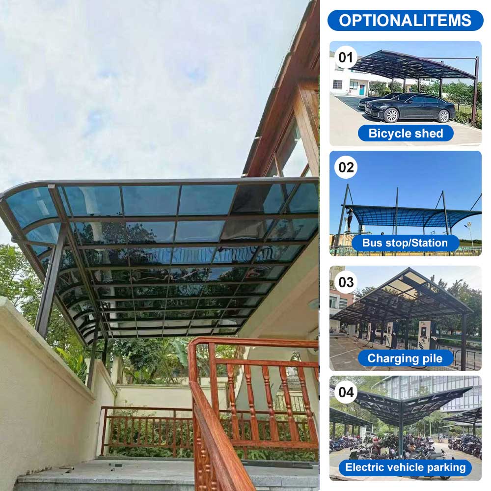 PC carports and canopies are made of polycarbonate sheets. They offer excellent light transmittance and strong impact resistance, making them widely used in homes and businesses.