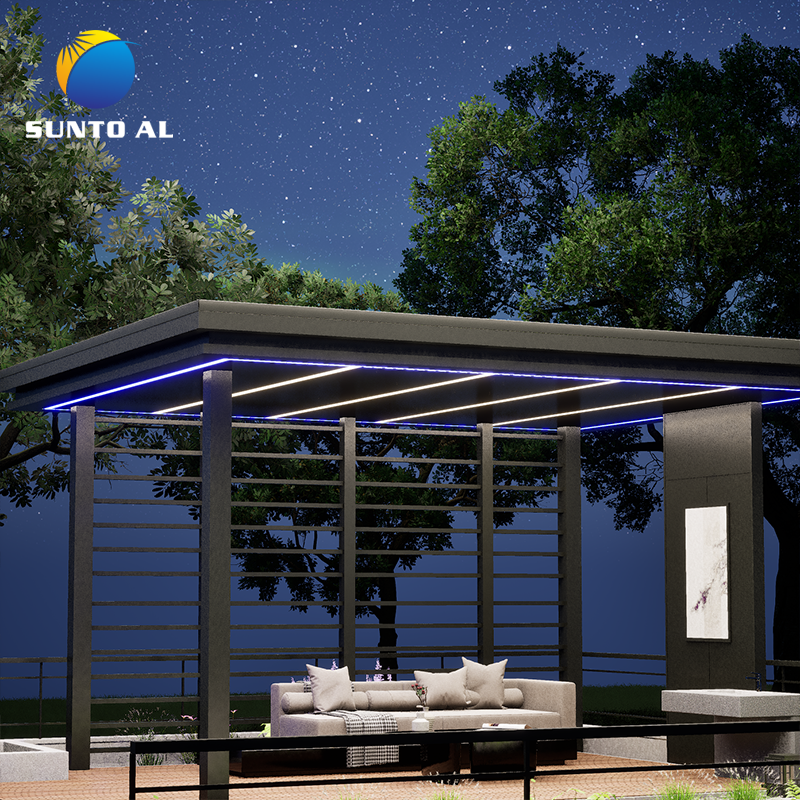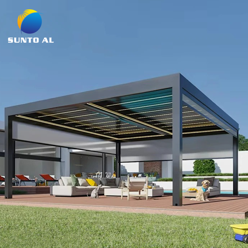 Sunto Outdoor Steel Pergola Gazebo with Aluminium Canopy Wall Mounted LED Lights Waterproof Motorized Roof Cover Louver Opening - 副本
